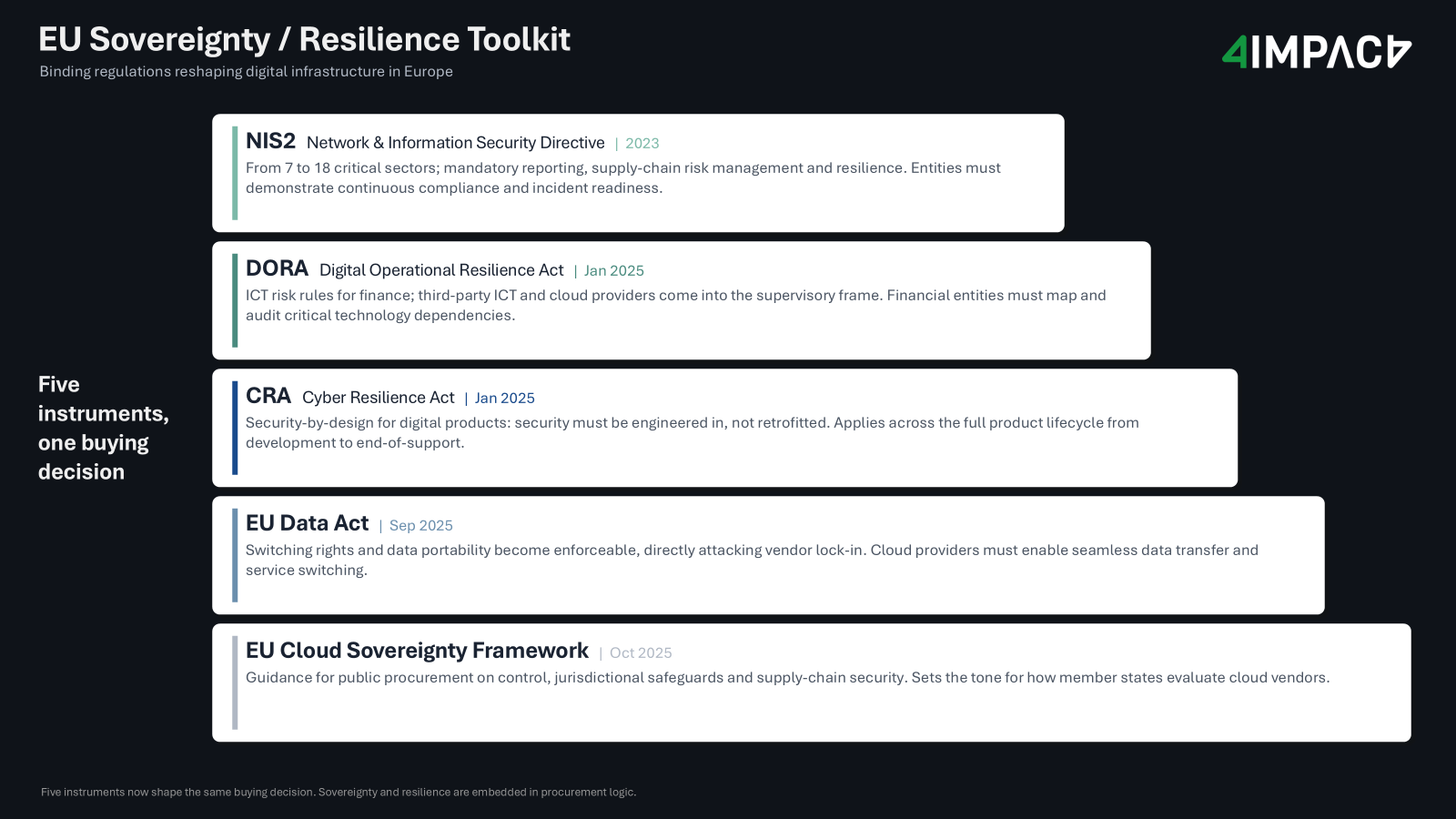 This is not a new concern. The problem has been legible to European policymakers since at least the Snowden revelations of 2013 and the subsequent Schrems judgments dismantling EU-US data transfer frameworks. What has changed since 2022 is the move from aspiration to binding obligation: a stack of regulation that collectively redesigns the legal landscape for digital infrastructure procurement.